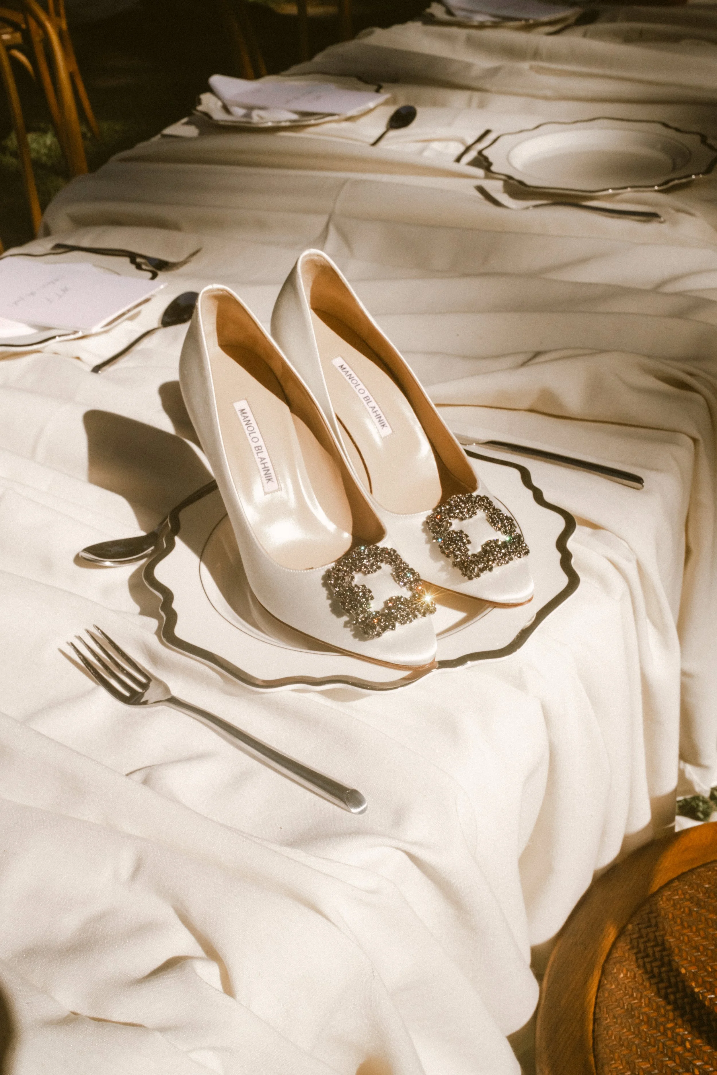 A pair of white high-heeled shoes with decorative buckles on a formal dining table set with silverware, plates, and folded napkins.