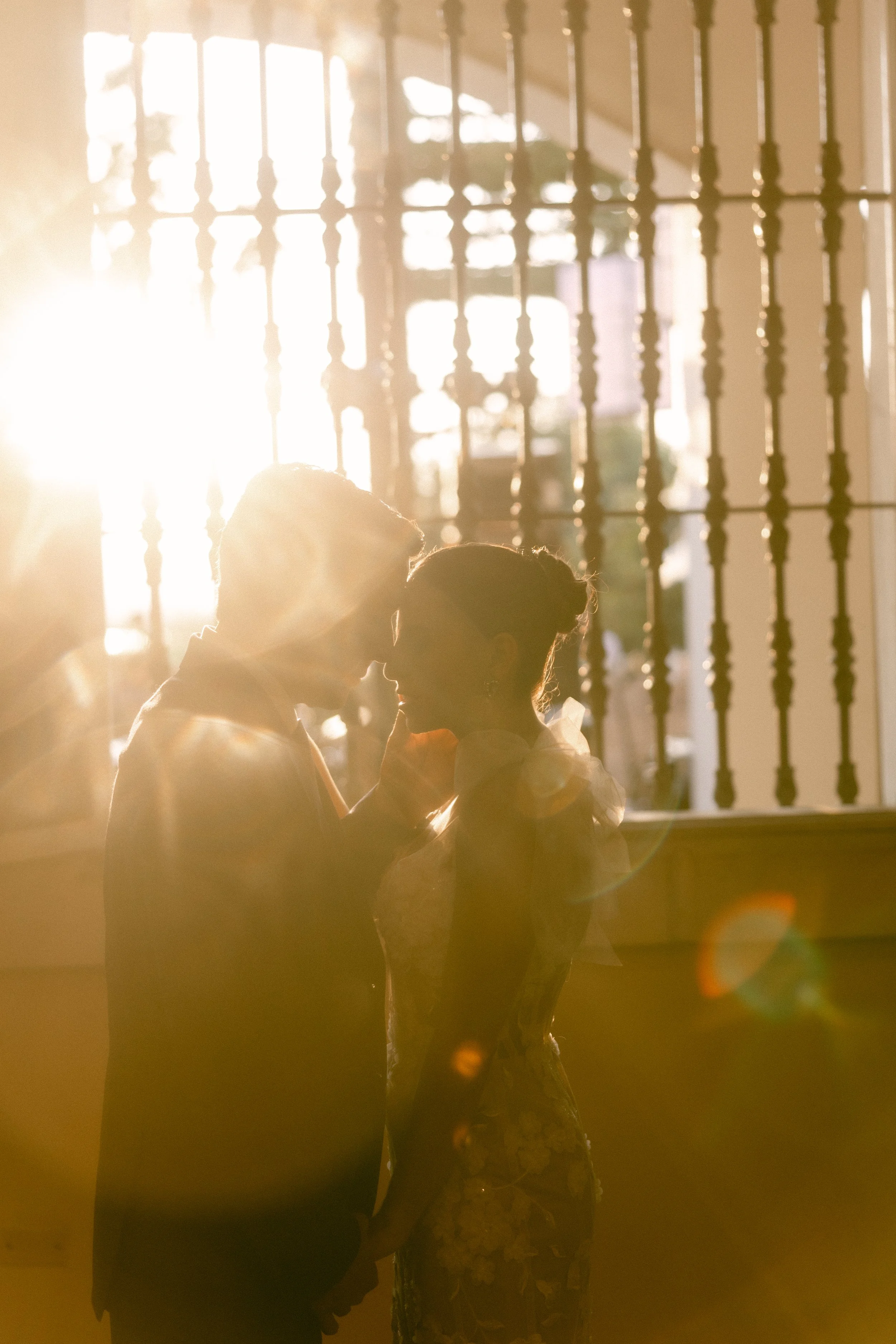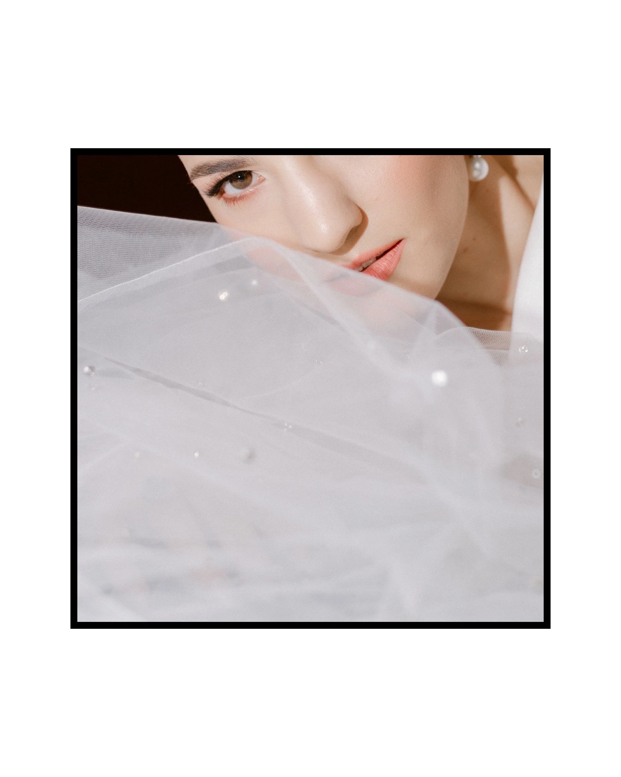 A bride sitting on a chair with a veil over her face, smiling as a man leans in to kiss her forehead in a cozy indoor setting.