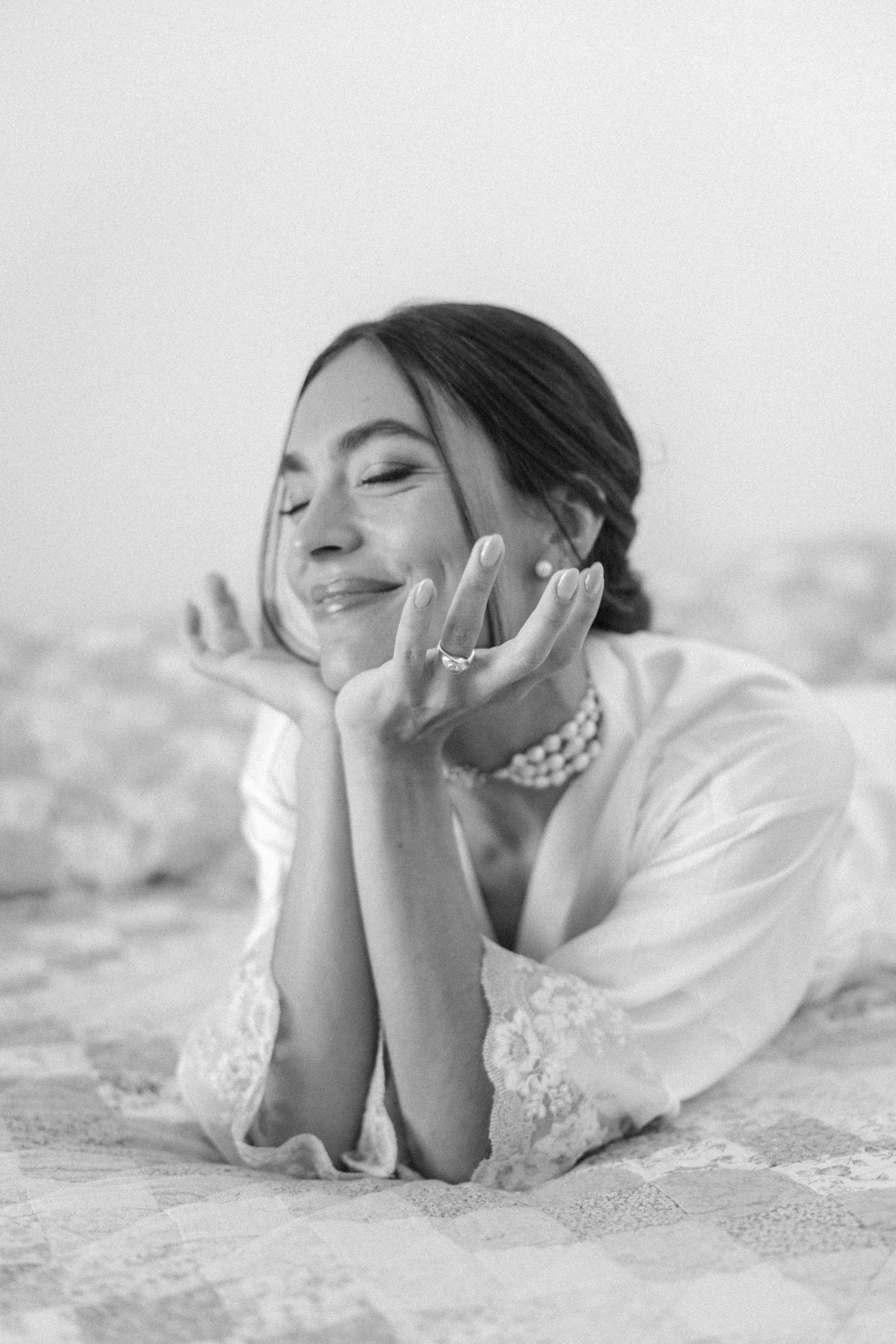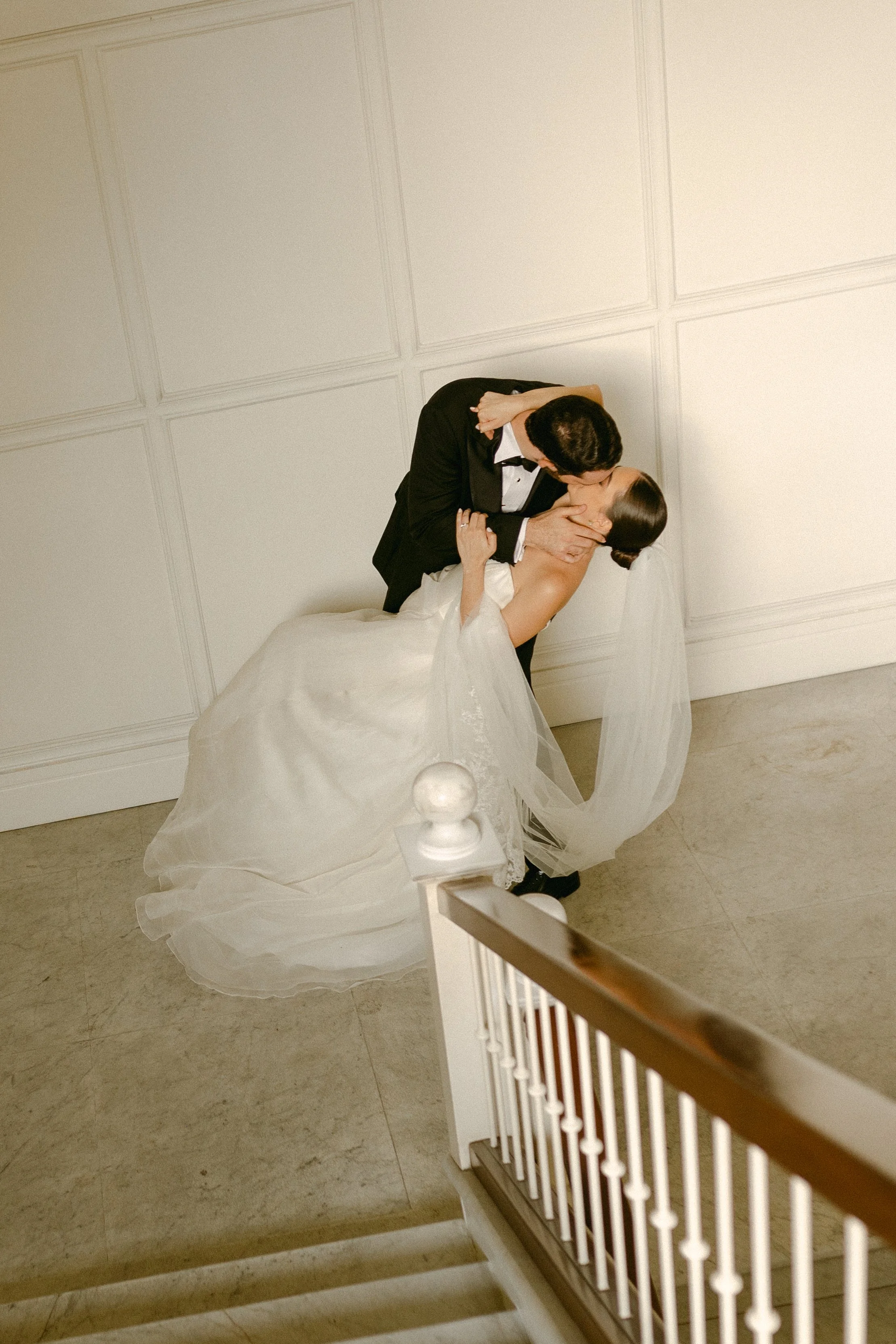 A black and white photograph of a bride and groom in a romantic moment, with the groom sitting and the bride leaning over him. The bride is wearing a wedding dress, a pearl necklace, and a veil, while the groom is in a tuxedo with a boutonniere, in a