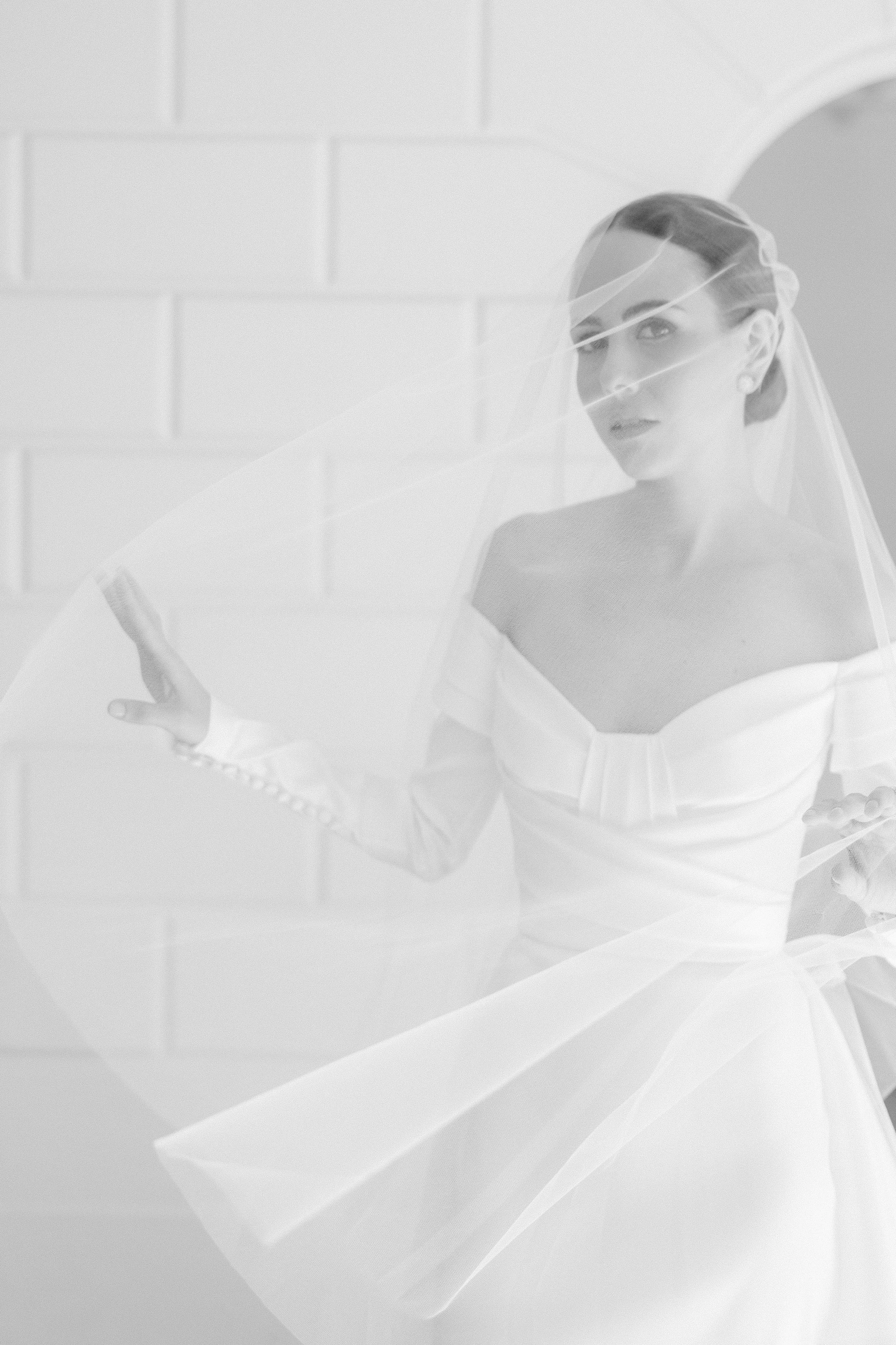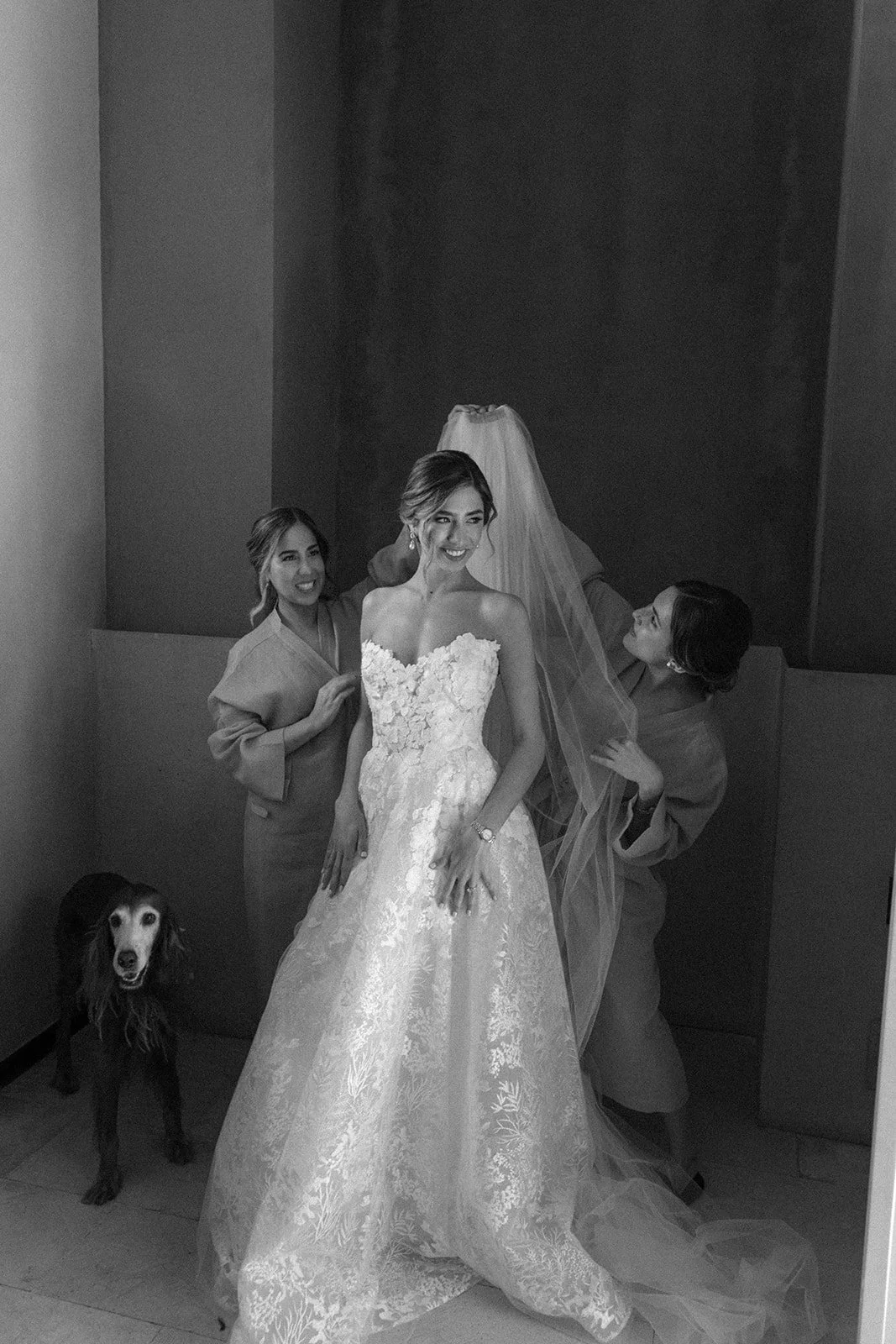 A bride in a lace wedding gown and veil, with her hands resting on her waist, standing indoors against a dark wall.